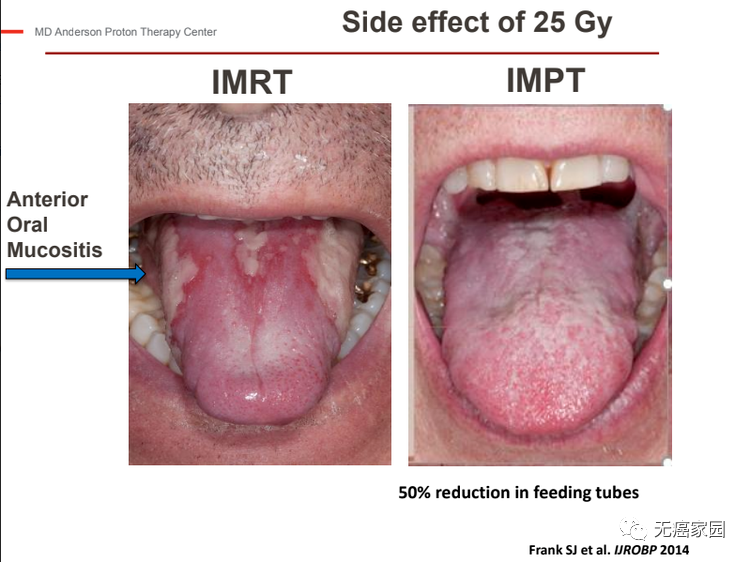 图片显示 IMRT(左)和放射质子治疗(右)的口腔反应
