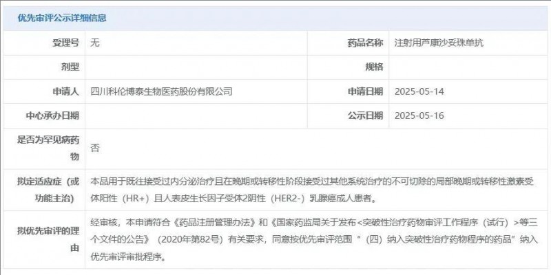 2025年5月16日,中国国家药监局药品审评中心(CDE)传来振奋人心的好消息——注射用芦康沙妥珠单抗正式纳入优先审评,用于成人既往接受过内分泌治疗,且在晚期或转移性阶段接受过其他系统治疗的不可切除局部晚期或转移性激素受体阳性(HR+)、人表皮生长因子受体2阴性(HER2-)乳腺癌的治疗。