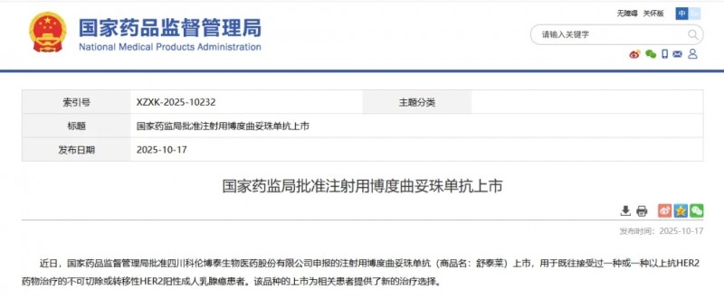 2025年10月17日,科伦博泰研发的一款靶向HER2的ADC药物+——博度曲妥珠单抗,获中国国家药品监督管理局(NMPA)批准上市,用于既往至少接受过一种抗HER2治疗的HER2阳性不可切除或转移性乳腺癌成人患者的治疗。...