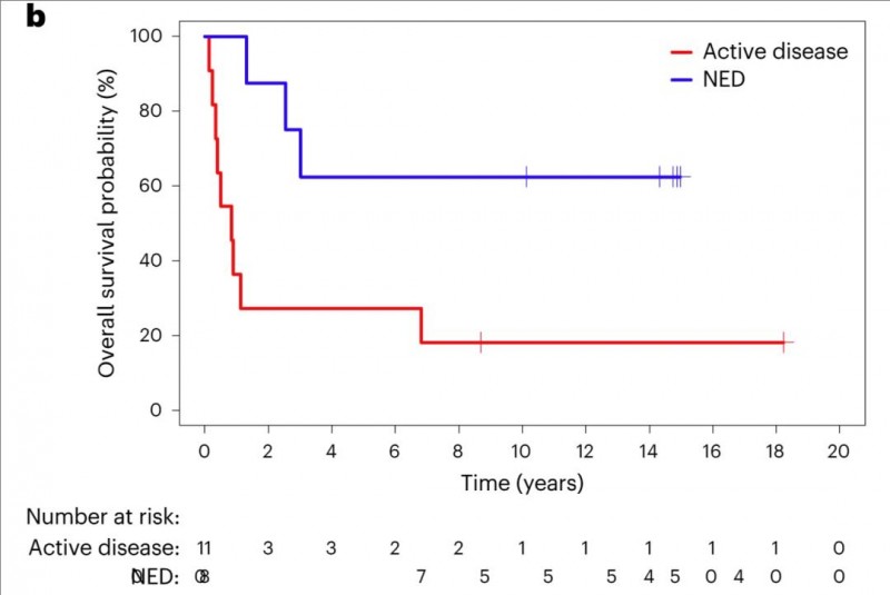 数据依然很震撼:在11名输注时存在活动性疾病的患者中,1例达到部分缓解(PR),3例实现完全缓解(CR)。其中,2例患者的完全缓解状态维持了8年;15年总生存率(OS)为36.8%,活动性疾病患者为18.2%,无病状态(NED)患者为62.5%(P=0.019,详见下图)。